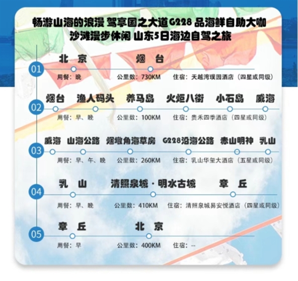DAY 01北京--烟台  730KM餐:晚      住:烟台    早8点 京台高速(G3)万庄服务区集合,粘车贴,发手台,随后车队出发前往烟台,沿途午餐服务区自理。下午到达后入住酒店,酒店晚餐后自由活动,可以前往所城里逛一逛,感受所城里的烟火气和美丽的夜景。